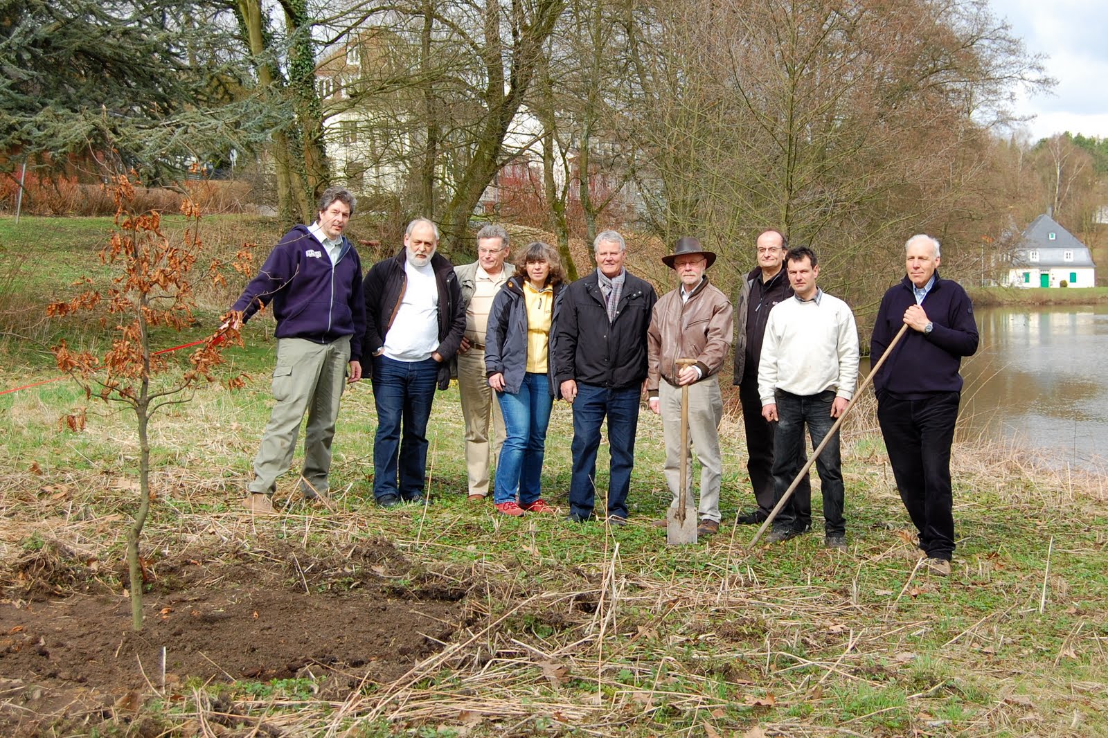 Das zwei Meter hohe Bäumchen steht für die nächsten zweihundert Jahre am Goldberger Teich, zwischen Goldberger Mühle und der "Brücke mit den krummen Beinen".
